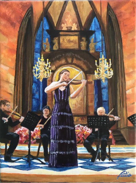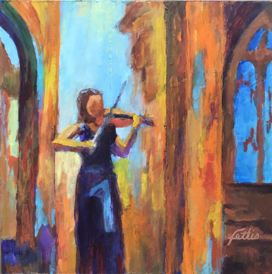 Busking by a church -abstract. (9” x12” canvas)-also appears in Abstract section.