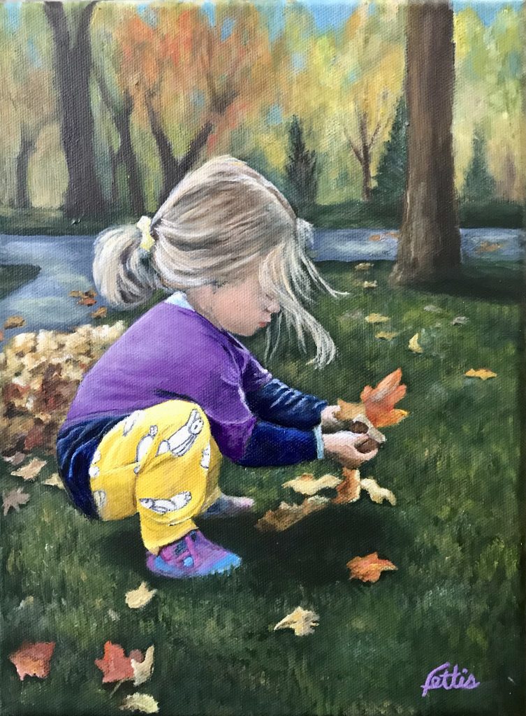 Painting 2/2 of my oldest grand-daughter. The wonder and joy of autumn leaves. (9” x 12”) SOLD
