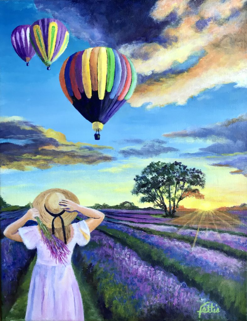 Young girl watching the hot air balloons over the lavender fields at sunrise. (11” x14”). Inspired by a Ginger Cook tutorial. SOLD