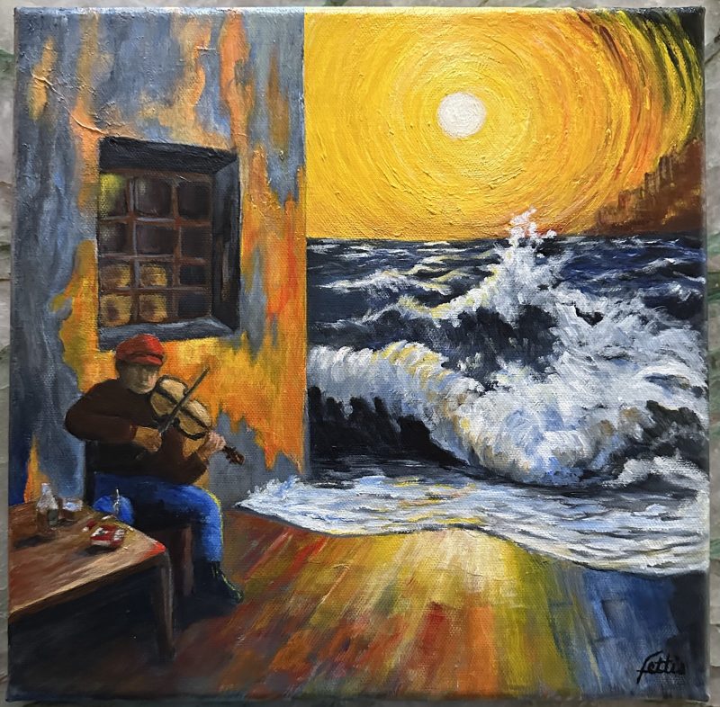 Fiddling while the world burns (9” x12” canvas). Inspired by a Ginger Cook tutorial.